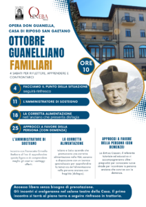 Mese di ottobre-mese guanelliano. Per celebrare e comprendere al meglio il carisma del fondatore sono stati promossi i sabati guanelliani rivolti ai familiari. Nell’ottica di una presa in carico olistica gli incontri verteranno su tematiche che riguardano gli aspetti della qualità di vita a partire da quelli sociali, amministrativi, legati all’alimentazione e al promuovere uno sguardo inclusivo e di dignità.